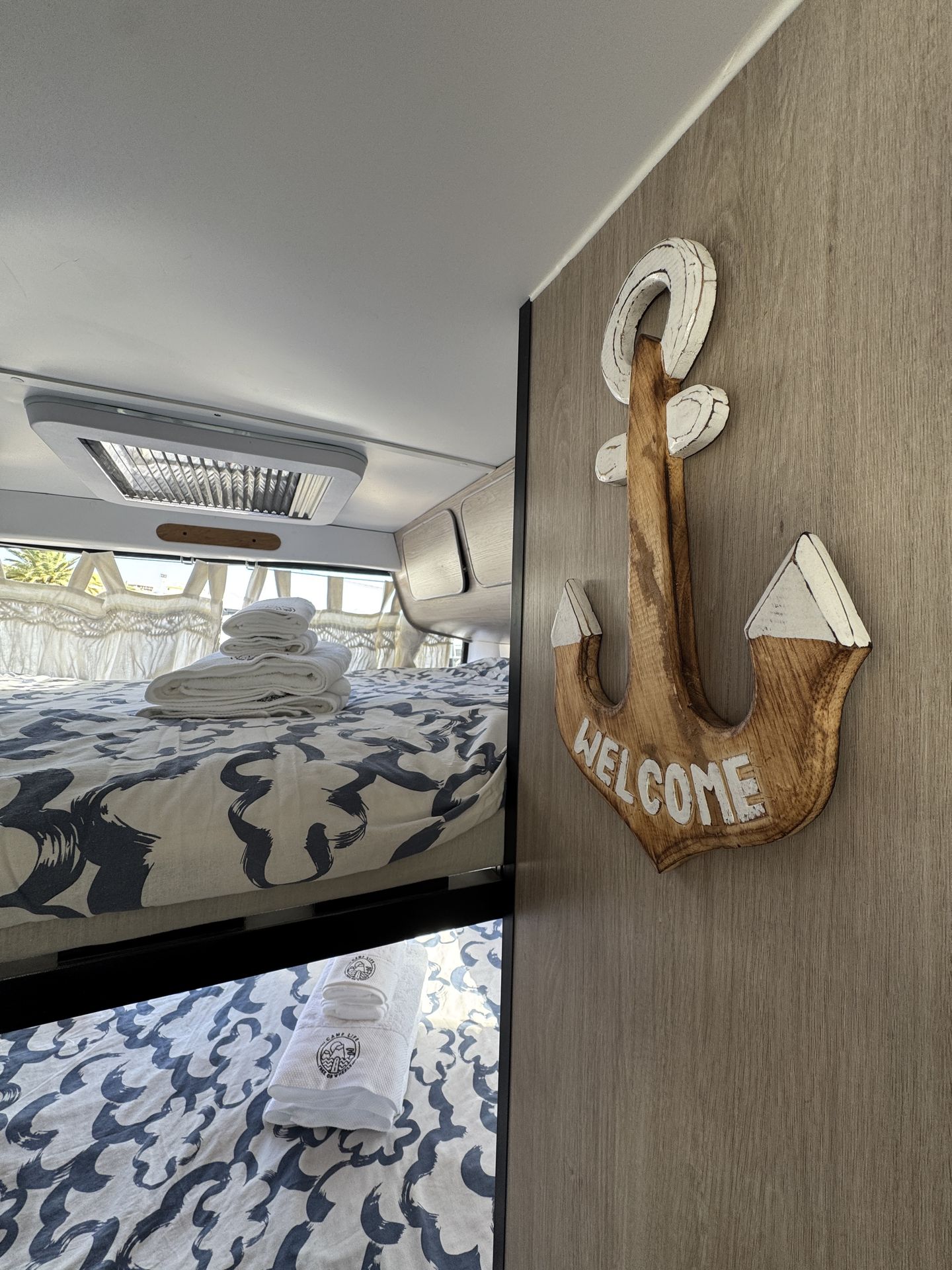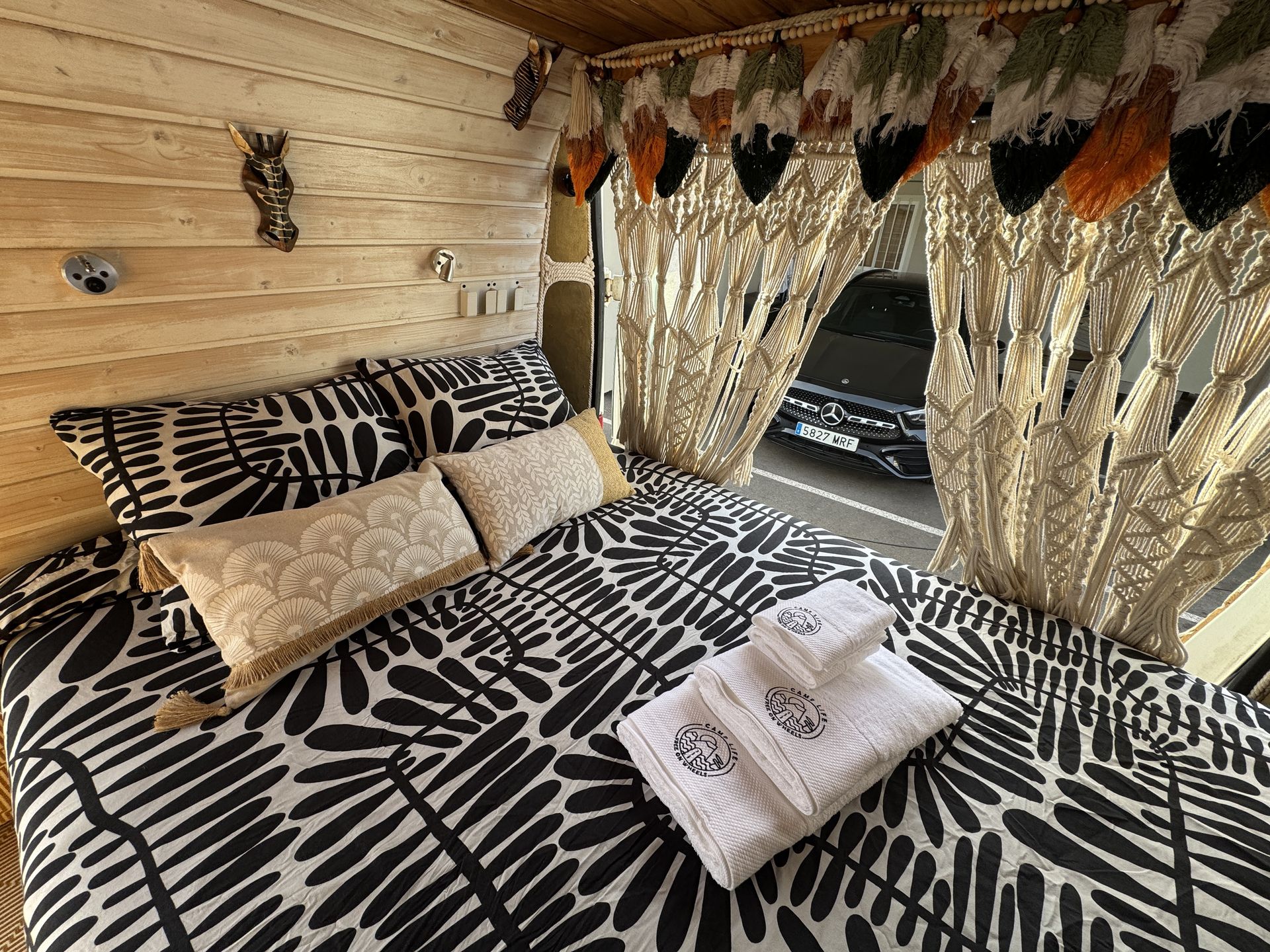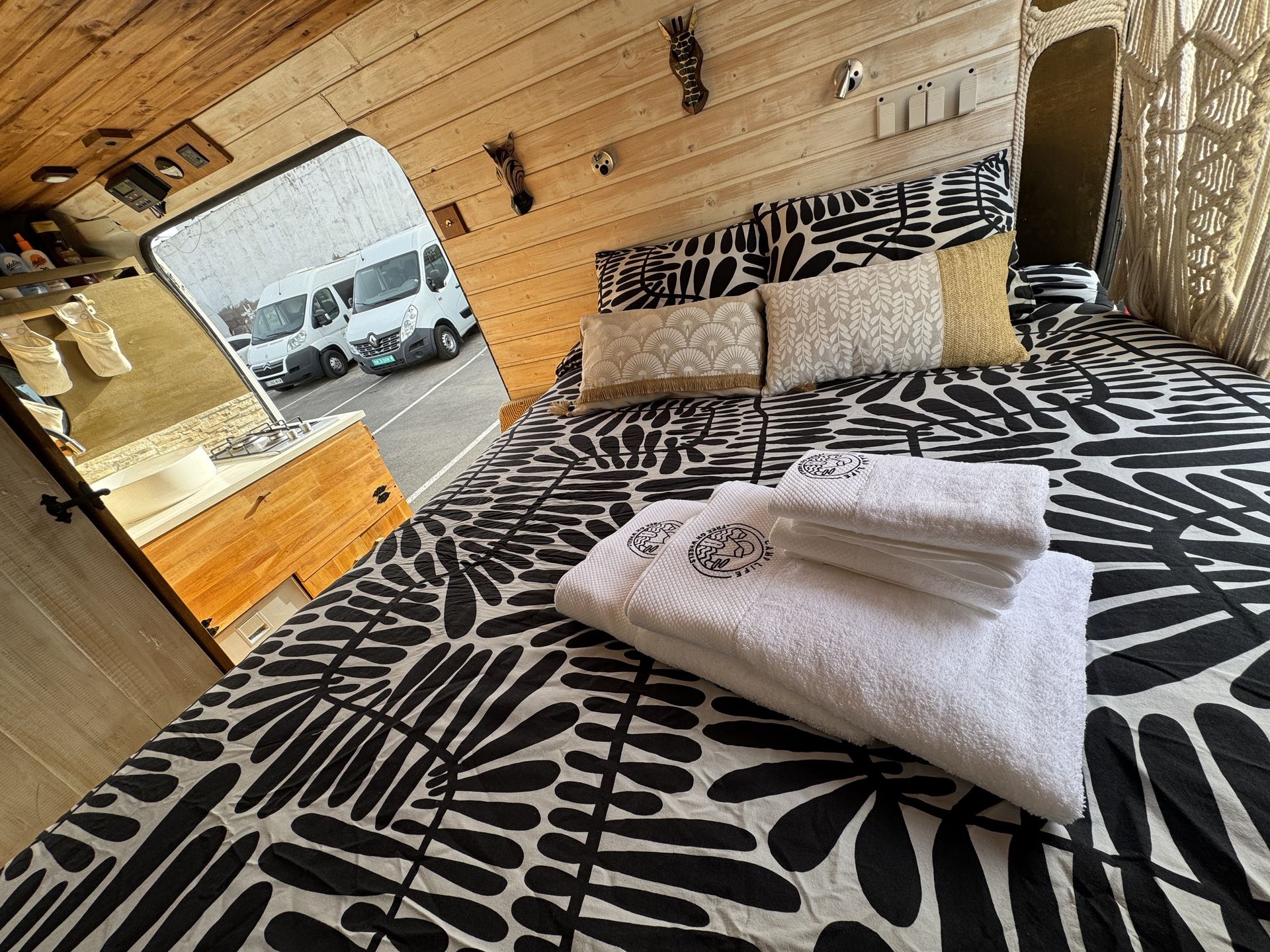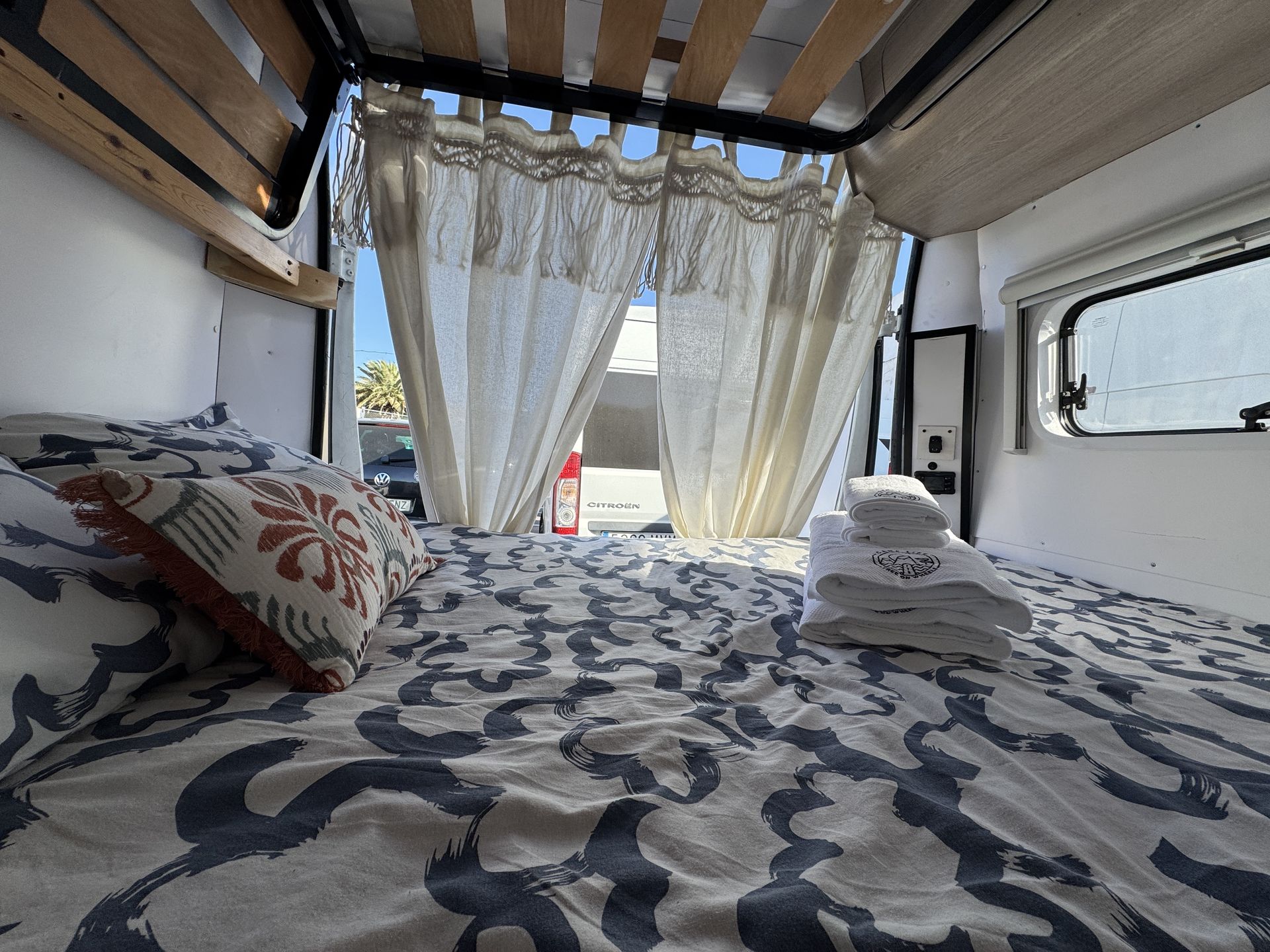 La caravana se entrega lista con las camas hechas, mantas adicionales, toallas de ducha y playa. Viene también con la mesa y sillas para el exterior. Está hecha para explorar la isla con total libertad sin tener que ir a un camping porque tiene una placa solar que va cargando las baterías.