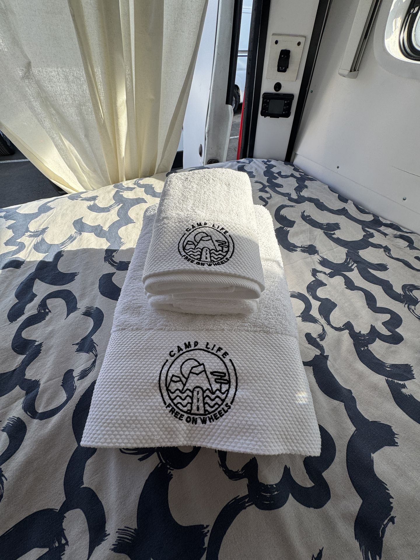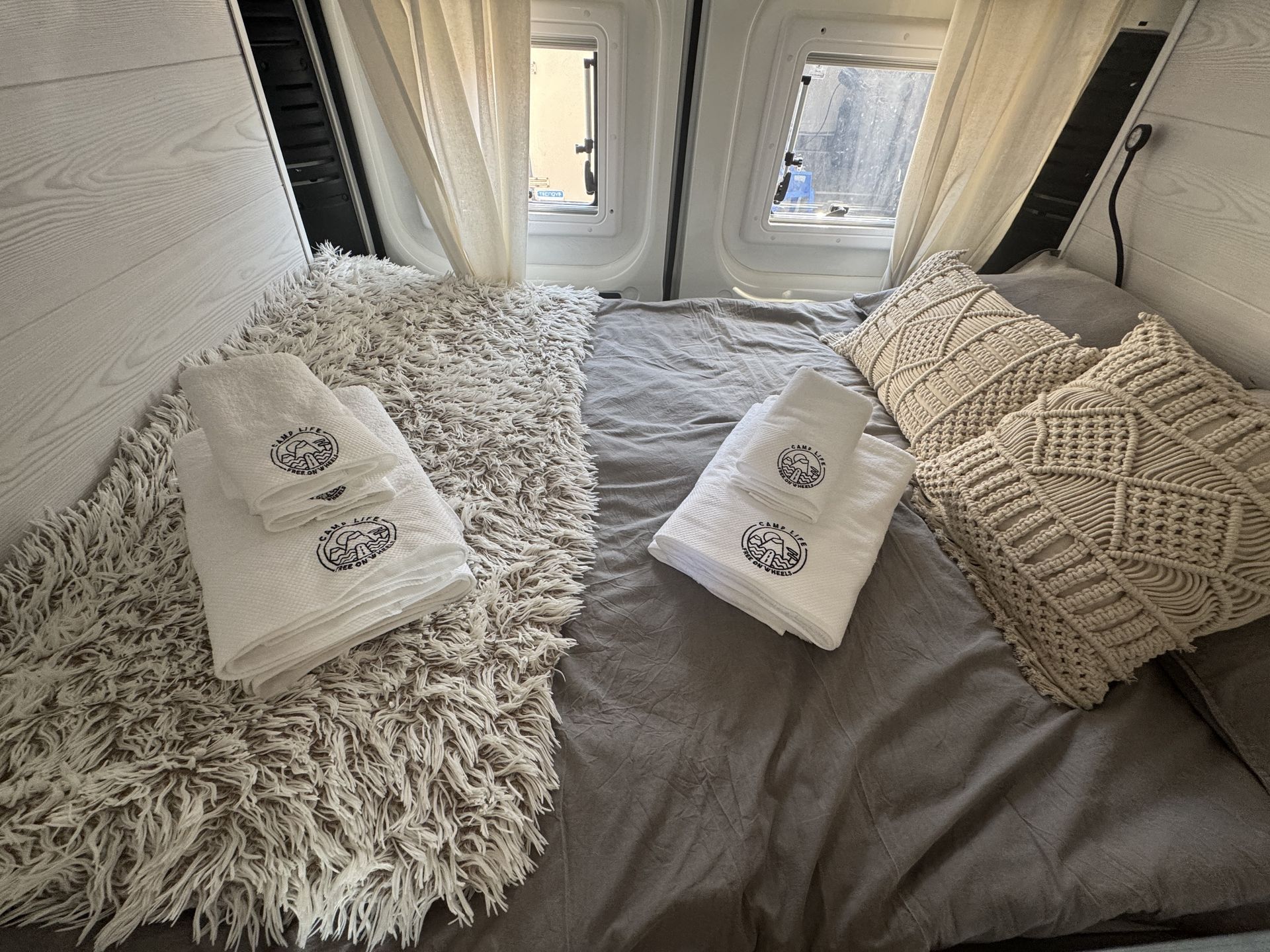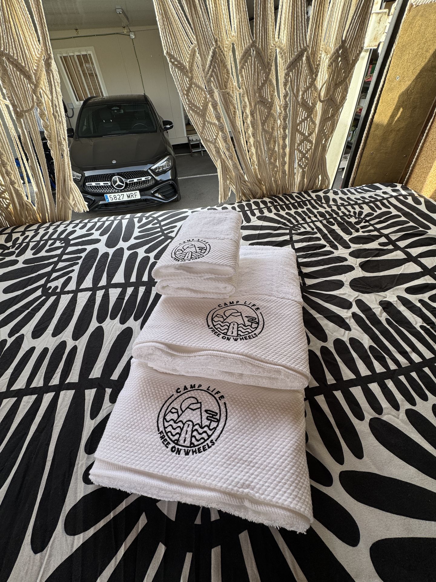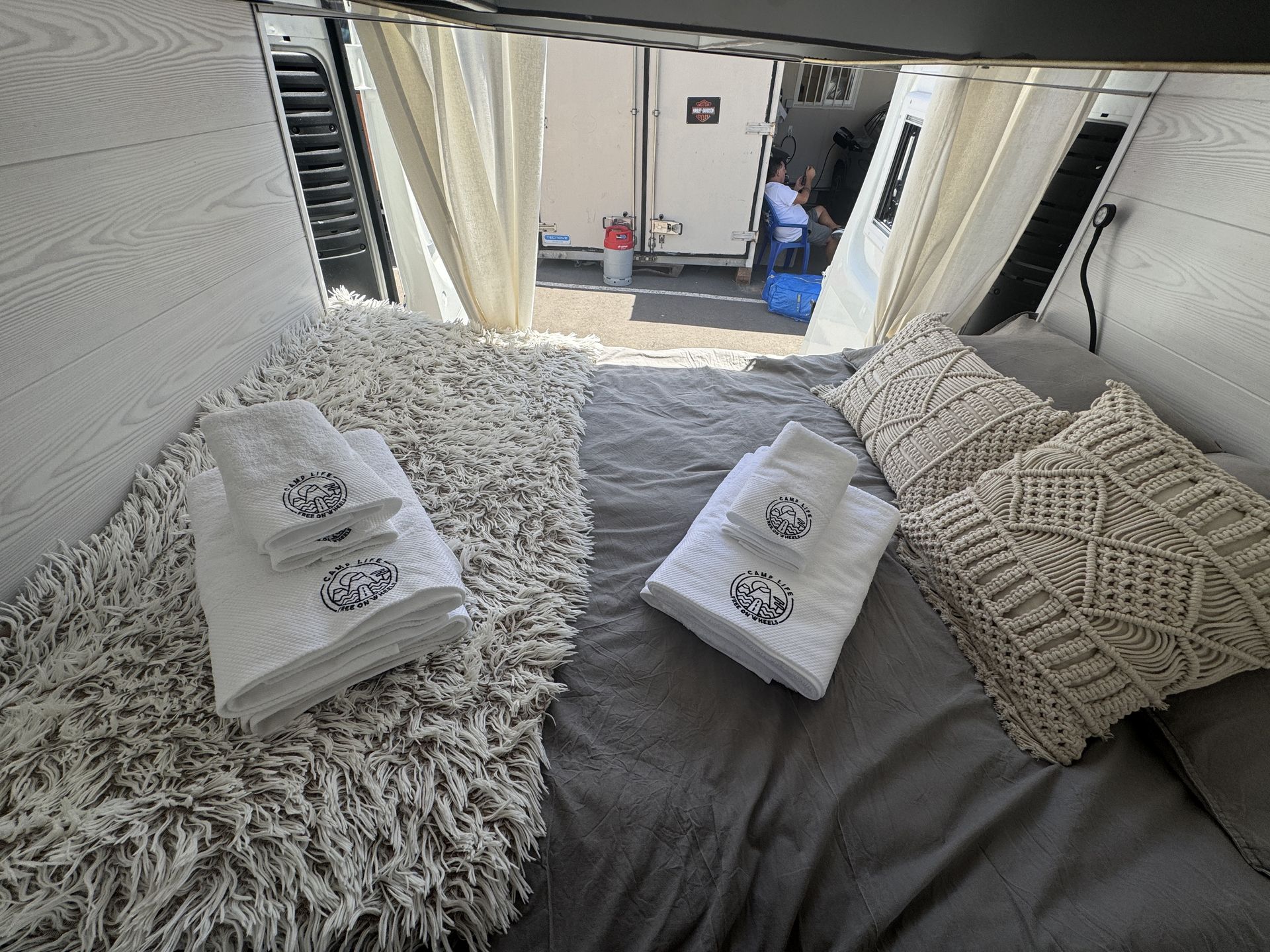 La caravana se entrega lista con las camas hechas, mantas adicionales, toallas de ducha y playa. Viene también con la mesa y sillas para el exterior. Está hecha para explorar la isla con total libertad sin tener que ir a un camping porque tiene una placa solar que va cargando las baterías.