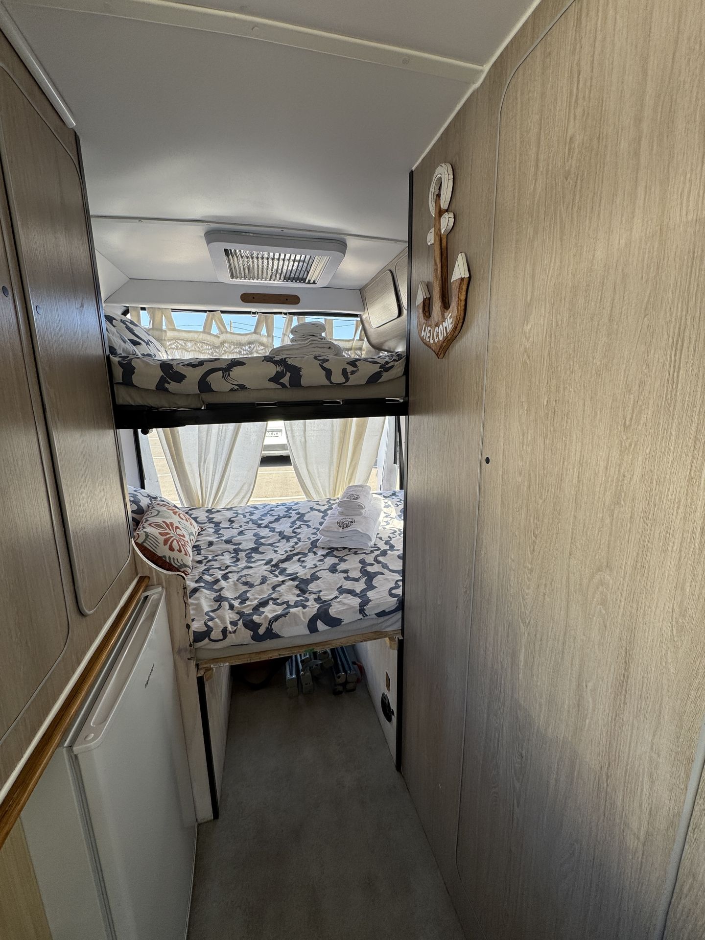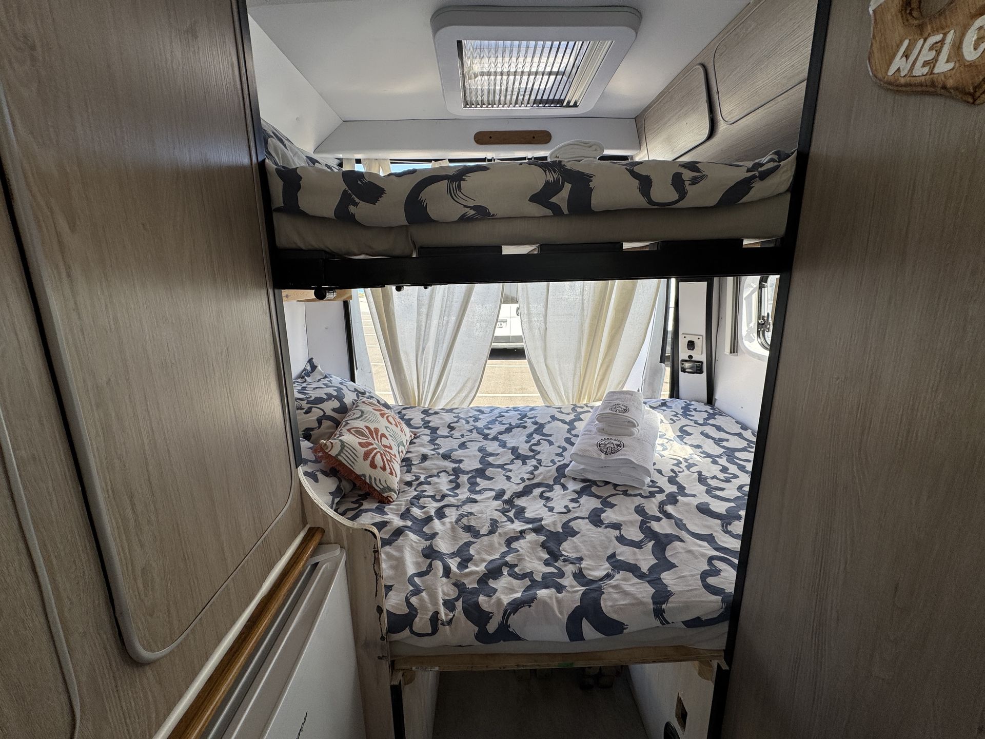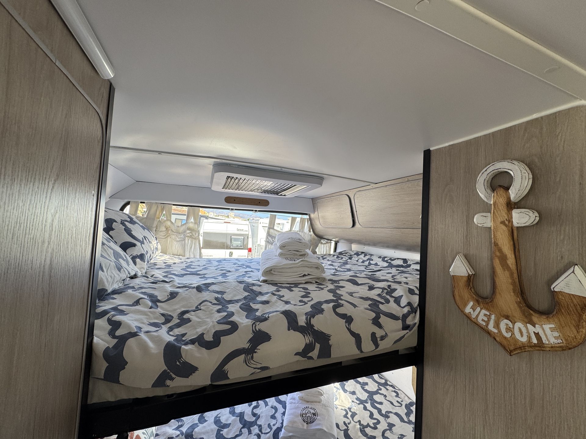 Esta camper es perfecta para familias, amigos o parejas que buscan comodidad y libertad en la carretera. Cuenta con dos camas en litera, una de ellas replegable en el techo, lo que la convierte en una opción muy práctica si solo viajan dos personas, dejando más espacio y comodidad durante el día.