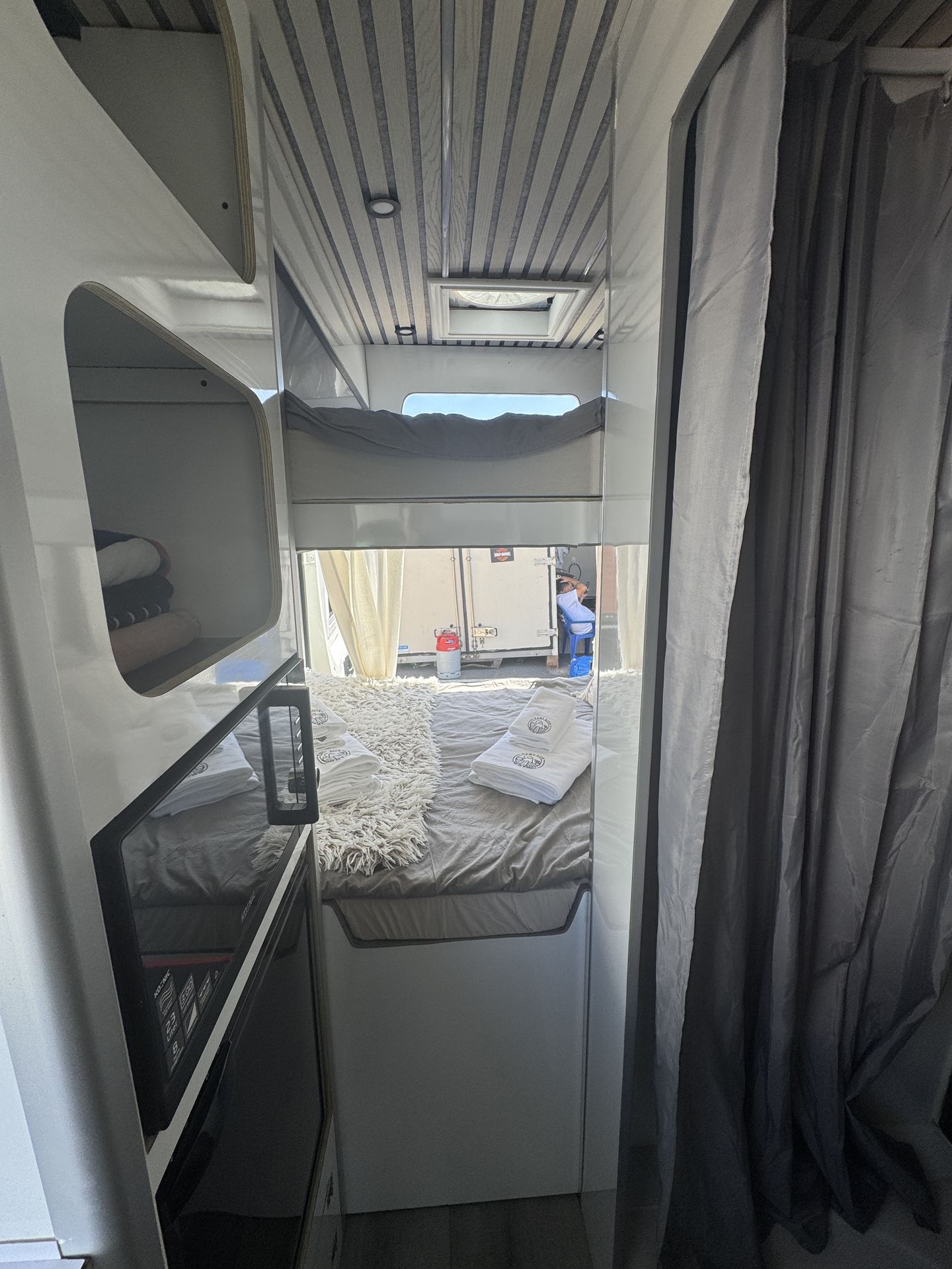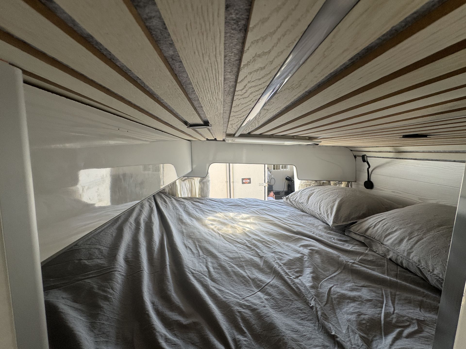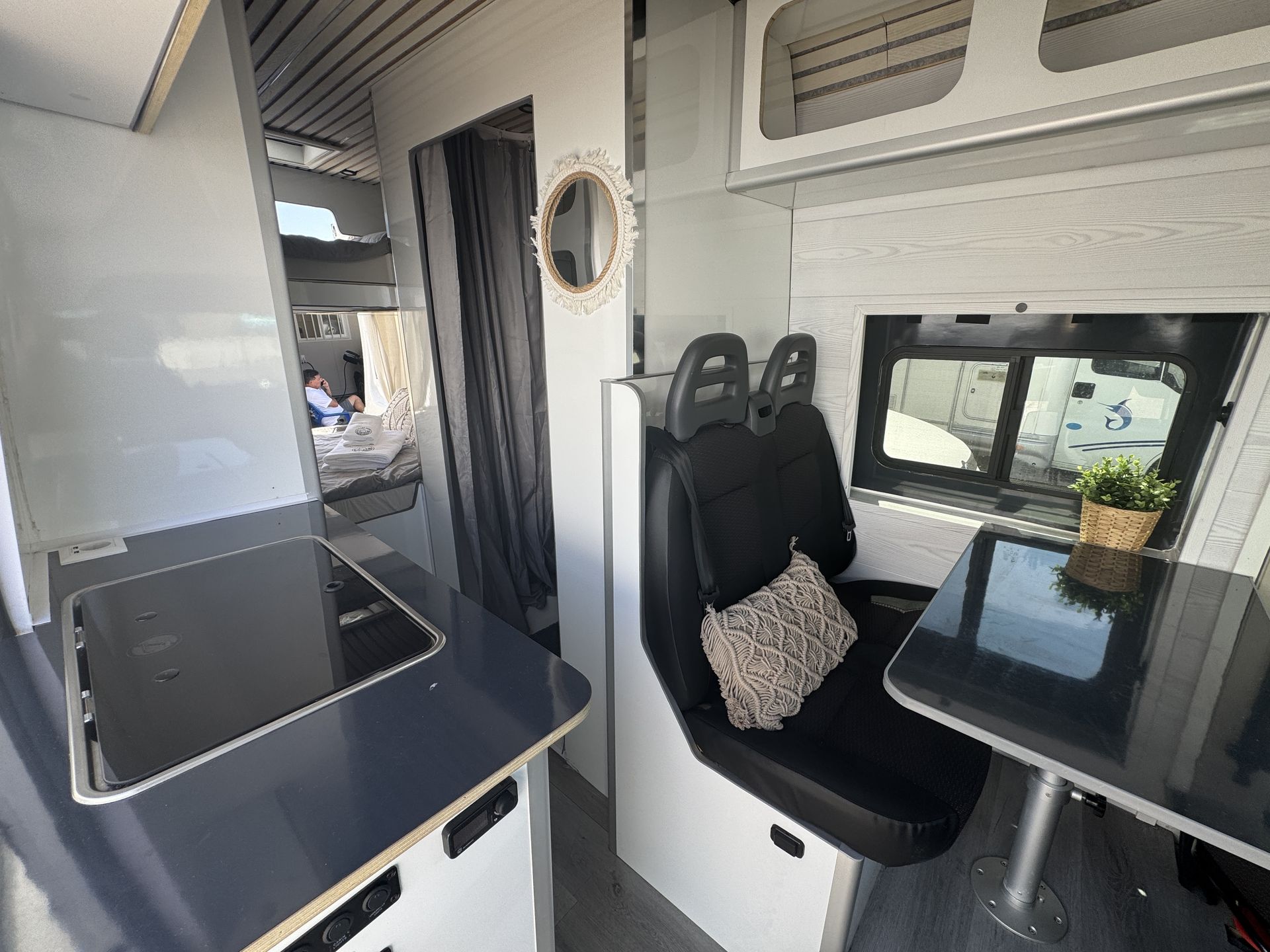 Esta camper es perfecta para familias, amigos o parejas que buscan comodidad y libertad en la carretera. Cuenta con dos camas en litera, una de ellas replegable en el techo, lo que la convierte en una opción muy práctica si solo viajan dos personas, dejando más espacio y comodidad durante el día.