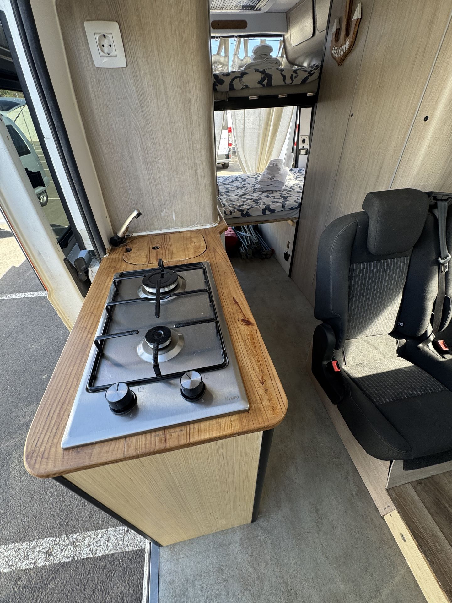 Cuenta con todo lo necesario para que no eches nada en falta: una cama amplia y cómoda, cocina equipada, agua caliente, electricidad gracias a paneles solares, y todos esos pequeños detalles que marcan la diferencia. Todo está cuidadosamente diseñado para que tu único plan sea disfrutar.